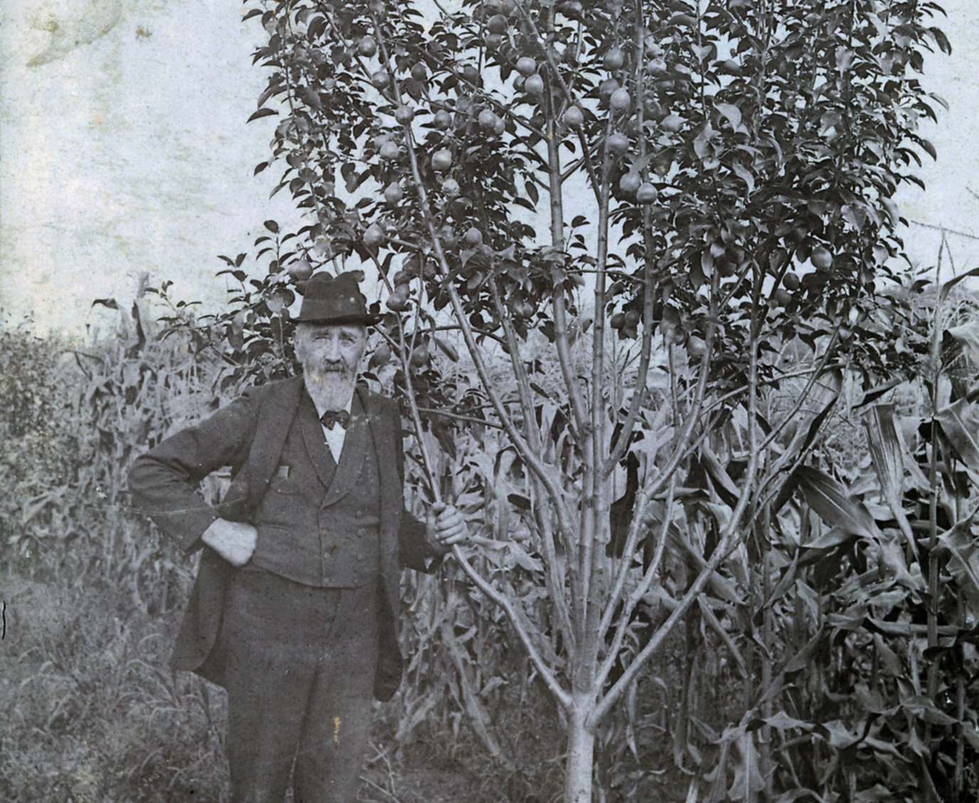 When Milton was older and brought his father back to live at the Homestead in Hershey, Henry was able to experiment with shade trees and imported fruit trees. He planted poplars throughout the Homestead and up the Horseshoe Pike. He also planted quince trees and proudly stands beside one in this photo.