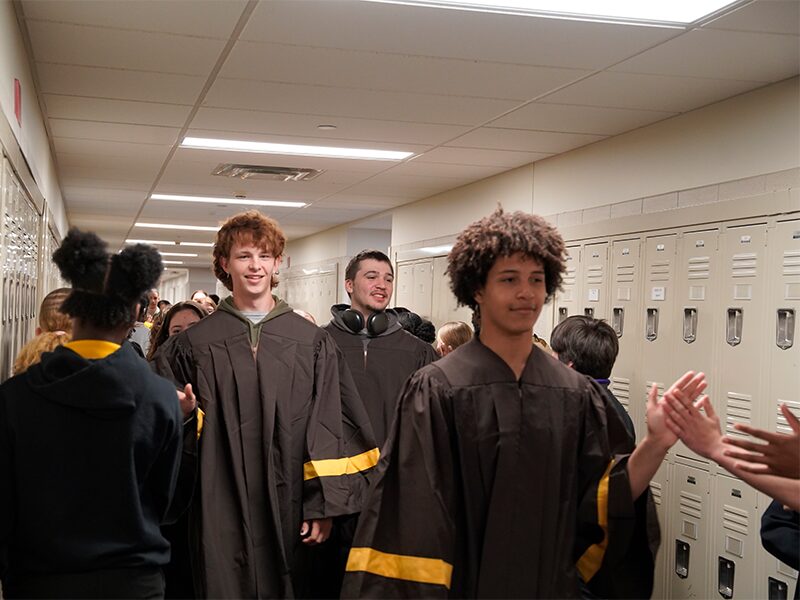 As Milton Hershey School seniors enter their final months before graduation in June, they marked another milestone on their journey toward Commencement by taking part in the annual MHS “High Five” event. Seniors who enrolled at MHS in first through eighth grade walked down the hallways of the Elementary and Middle Division scholastic buildings, exchanging high fives with their younger peers and the staff who have supported them along the way.