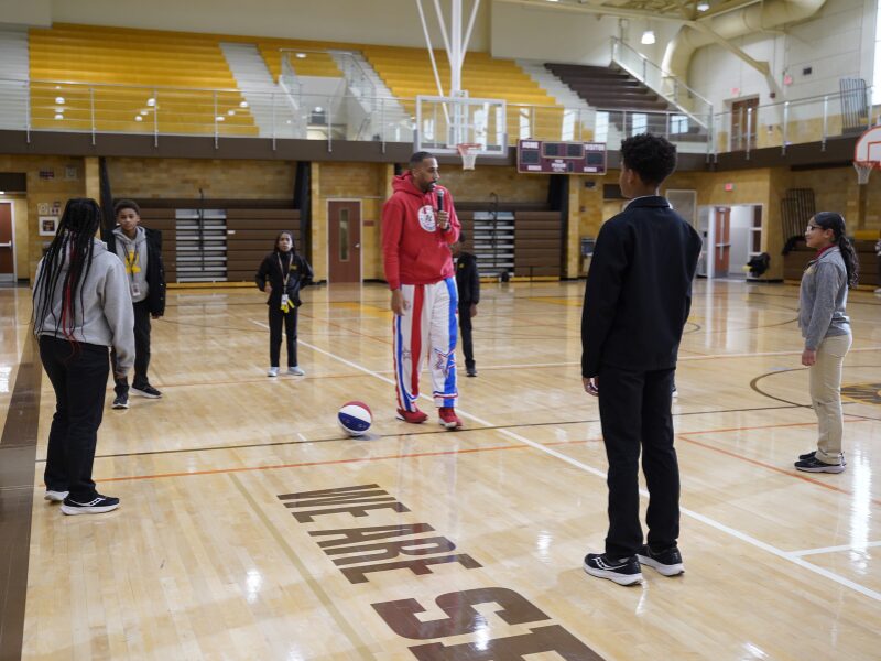One of the most exciting moments of the visit came when McClurkin introduced the Harlem Globetrotters’ famous “magic circle”—a signature pre-game routine where players form a circle and, in rapid succession, showcase their most impressive ball-handling skills and tricks. McClurkin invited six students to join him in the magic circle, teaching them a few techniques and encouraging them to step outside their comfort zones. He then demonstrated his own skills, drawing cheers and applause from the crowd.