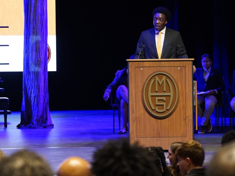 Senior John Ademuwagun opened the ceremony by reflecting on his life before MHS. Ademuwagun was born in the United States but attended school in Nigeria at the age of 10.
