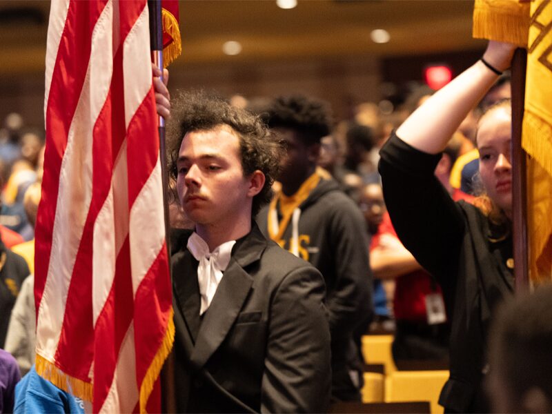 Following the 2024 Memorial Day Assembly, senior students attended a reverent wreath-laying ceremony at Hershey Cemetery. Earlier in the week, members of the Student Government Associations from all divisions placed flags around Founders Hall to honor those who died in service to America.
