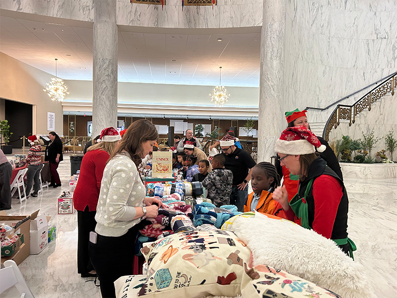 Several tables were set up on each side of the 30-foot Christmas tree in the Founders Hall Rotunda. As festive music filled the air, the young shoppers examined each item available, including toys, pillows, blankets, signs, and candy dishes.