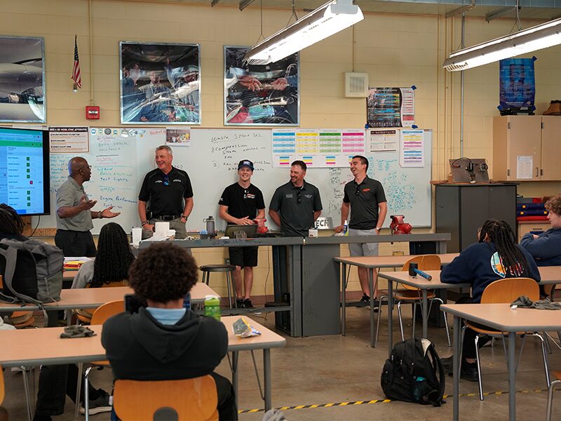 The visit began with drivers sharing the story of their racing careers. Then, they answered students’ questions about this career path and the skills they can learn in a classroom that can transfer into a professional racing experience.