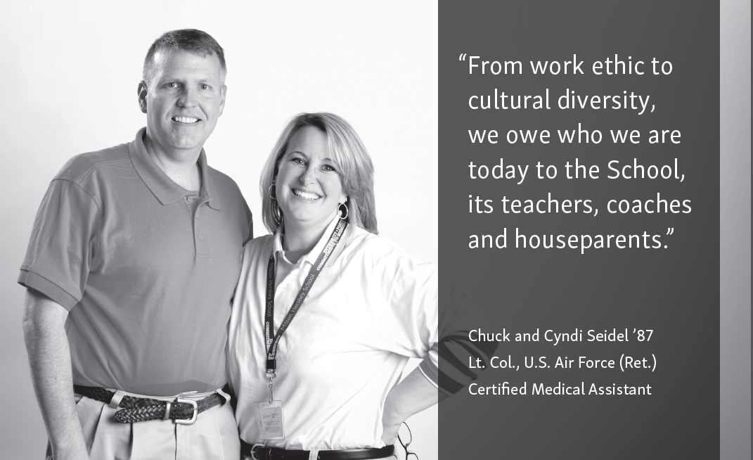Chuck and Cyndi Seidel both graduated from Milton Hershey School in 1987. Chuck recently retired as a Lt. Col. in the U.S. Air Force after a 27-year military career. He has been recognized with the Bronze Star, Defense Meritorious Service Medal, Air Force Achievement Medal, NATO Medal, and many other notable decorations.